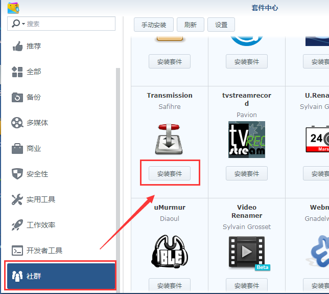 1、在“套件中心”的“社群”找到“Transmission”,点击“安装套件”,会自动下载安装