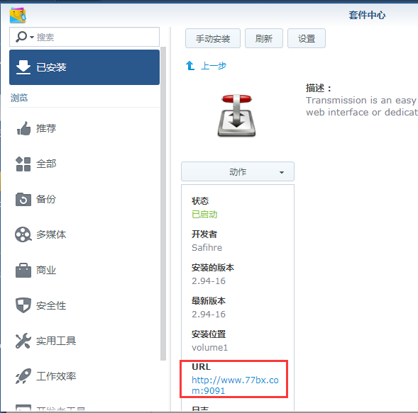 5、安装完成后后,打开“套件中心” ---> “Transmission”,找到URL,可以直接打开Web UI(如果你用内网地址安装,则显示内网地址)