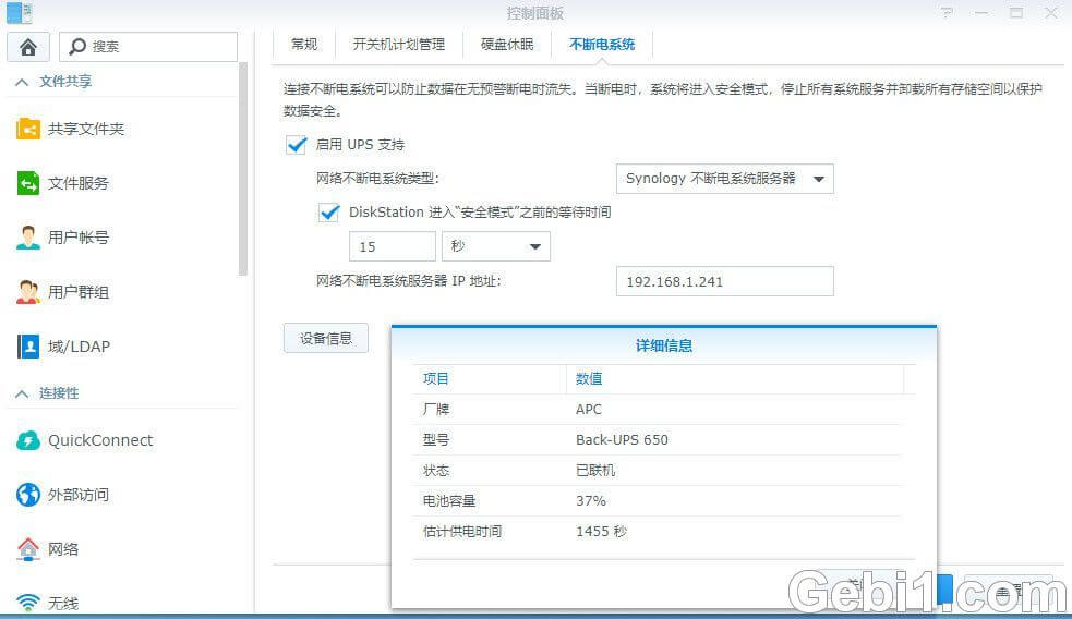 连接usb的黑群晖作为ups主服务器,设置如下: