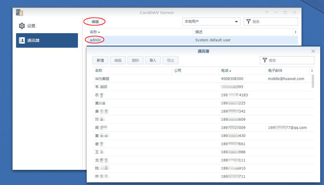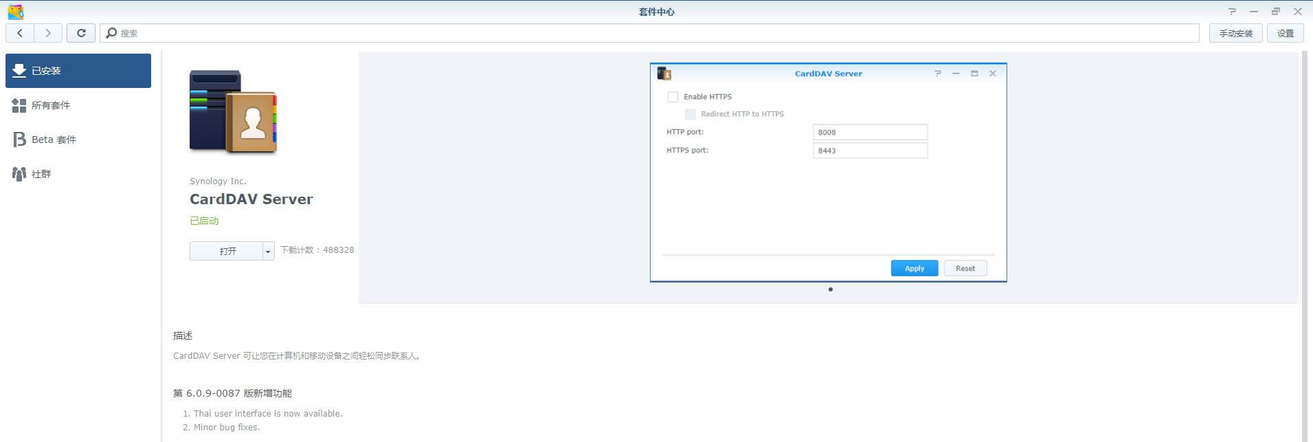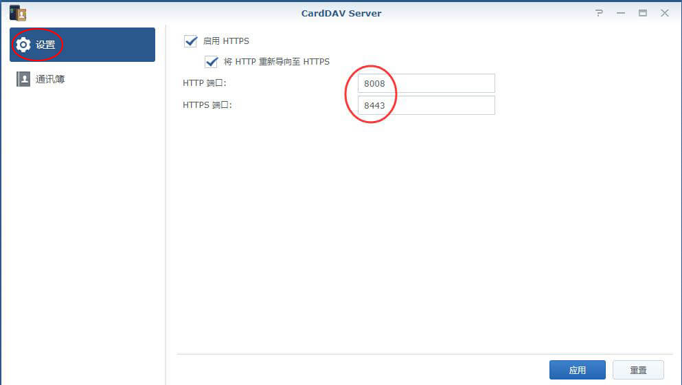 2、打开CardDav Server,点“设置”,设置端口,如果需要使用https协议,请勾选“启用https”,点“应用”后即可生效。