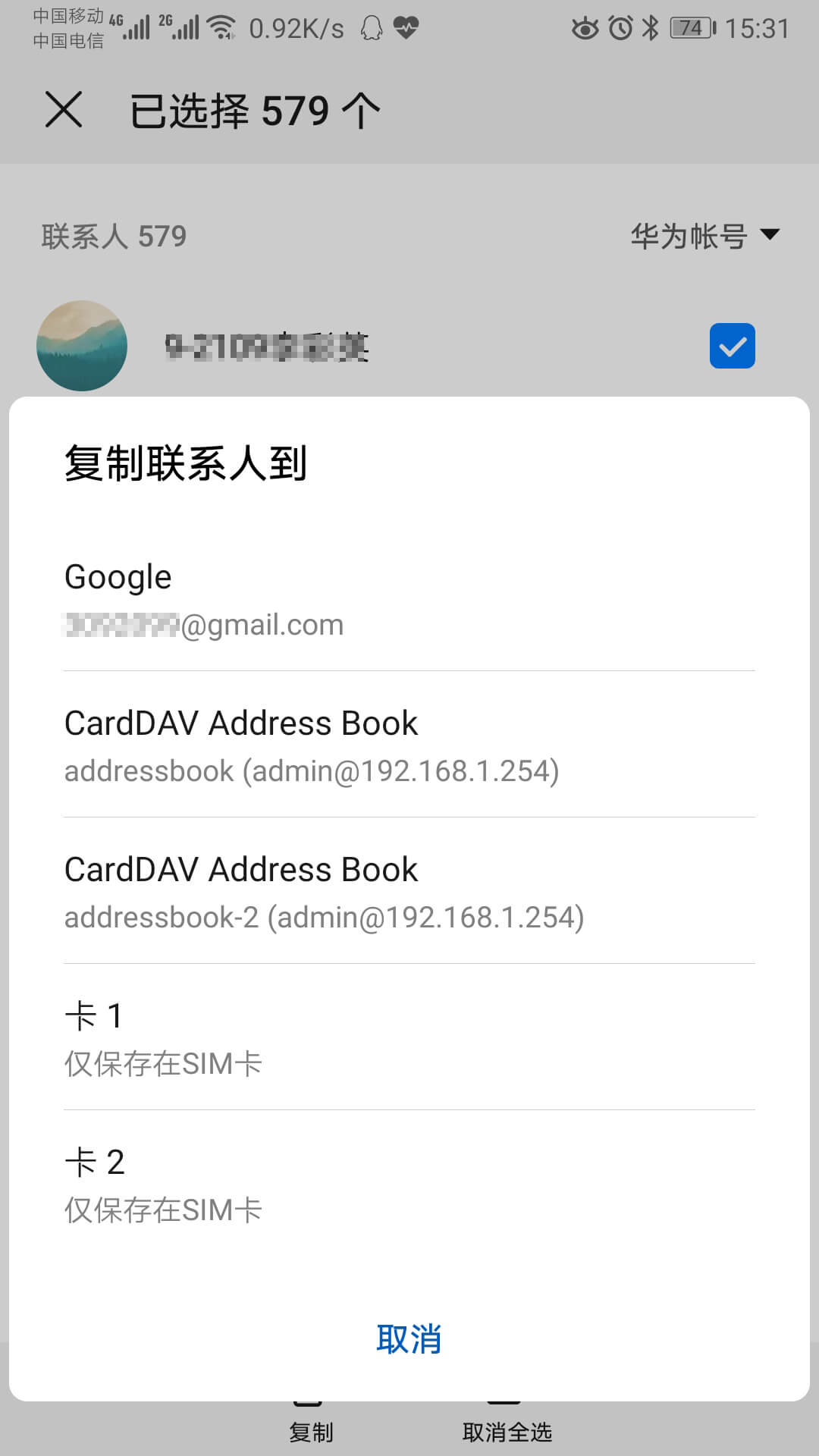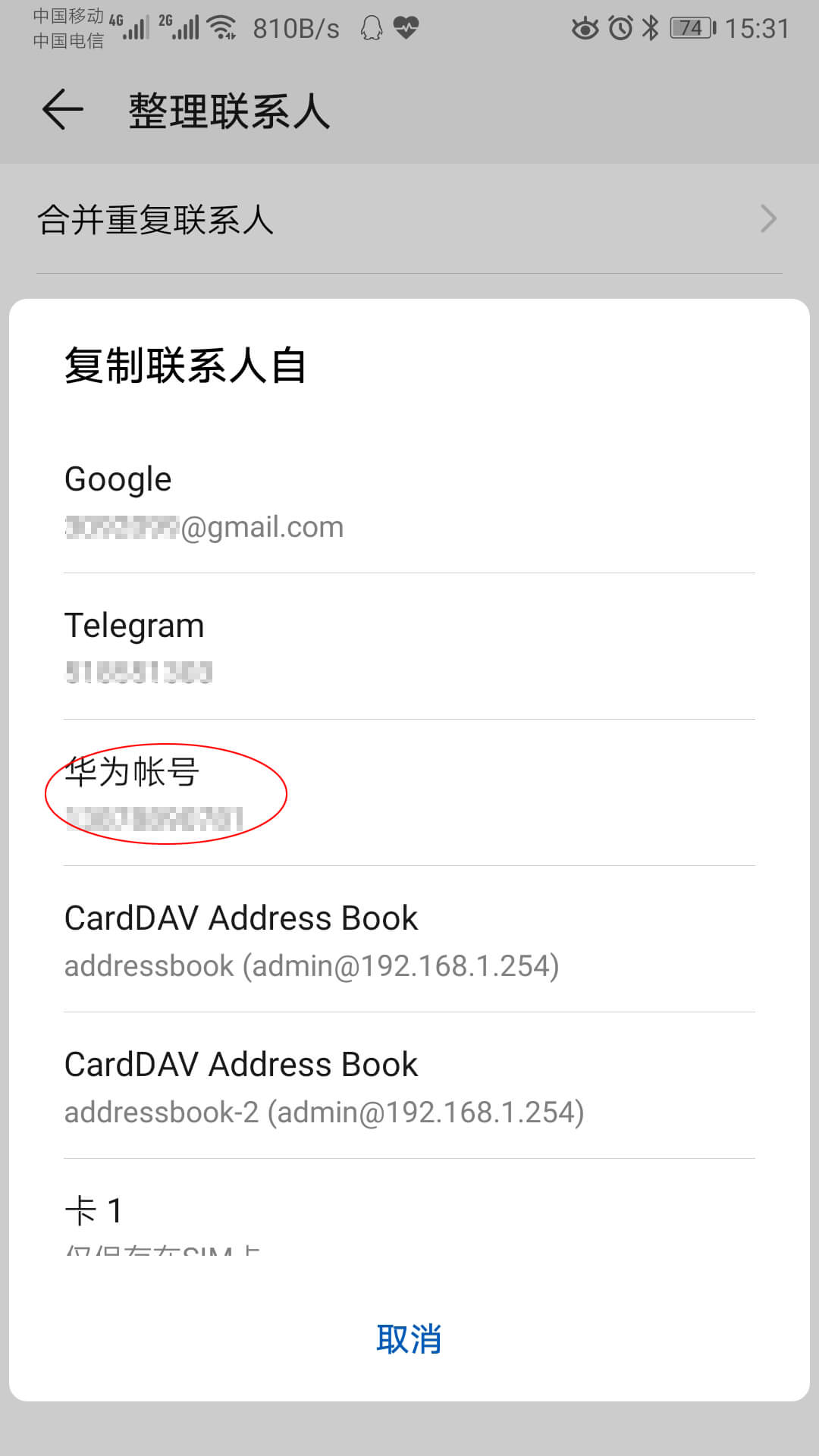 9、由于我手机放了两张卡,所以会有两个CardDav Address Book,请根据自己的需求作选择