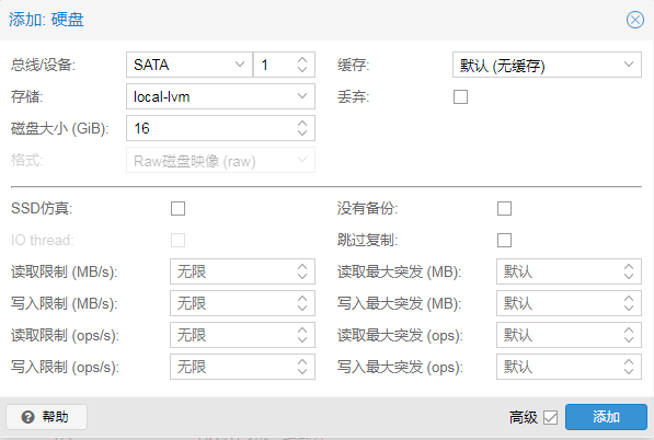 6、添加一块系统盘,点击“硬件”,添加“添加”下拉菜单中的“硬盘”,总线/设备选择SATA和1,存储选择local-vm,根据你的具体情况设置磁盘的大小(本教程设置为16G)