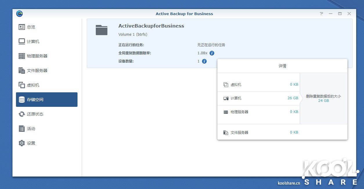 在Active Backup for Business管理界面的存储空间中,可以查看当前备份的空间占用和控制可释放文件空间。