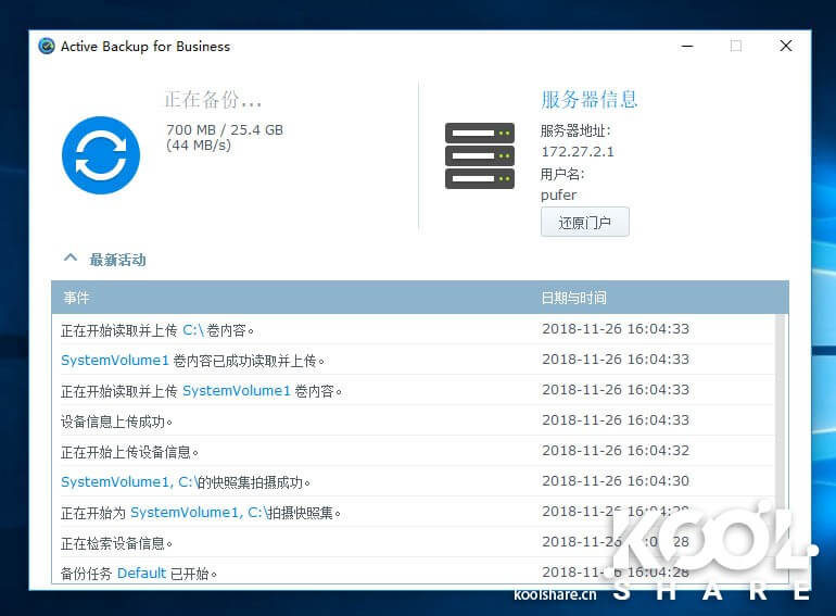 我们来开始第一次备份,Agent会显示当前正在备份和备份进度。第一次备份26G的数据,大概使用了10多分钟。Active Backup for Business的备份速度是相当的快。