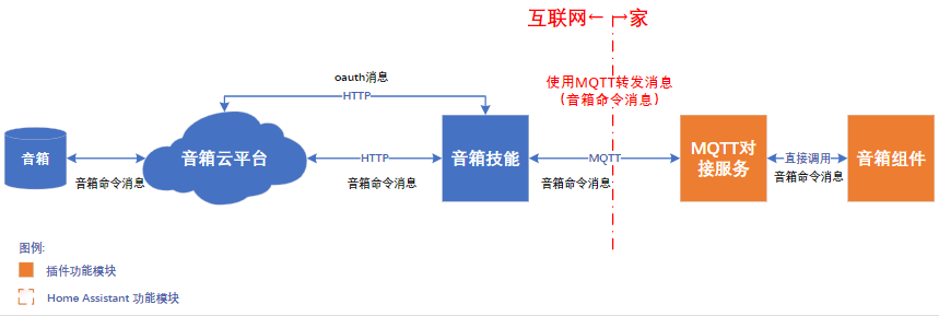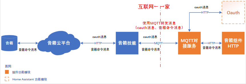 • MQTT对接服务配合本人搭建的mqtt中转服务,可以将音箱云平台的音箱命令消息、oauth消息转发到无公网环境下家中的Home Assistant。