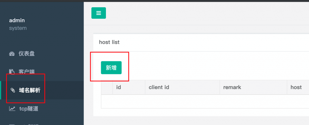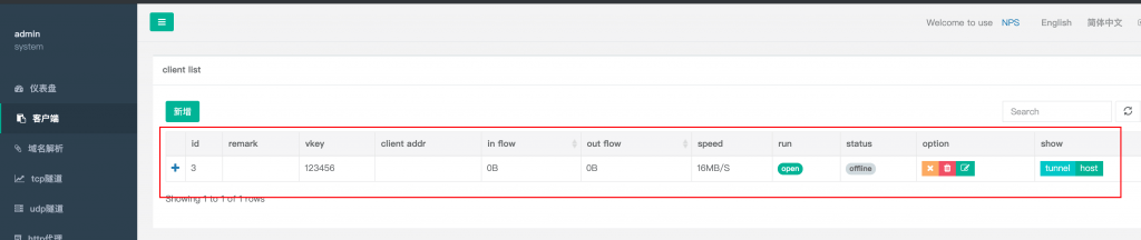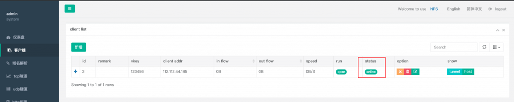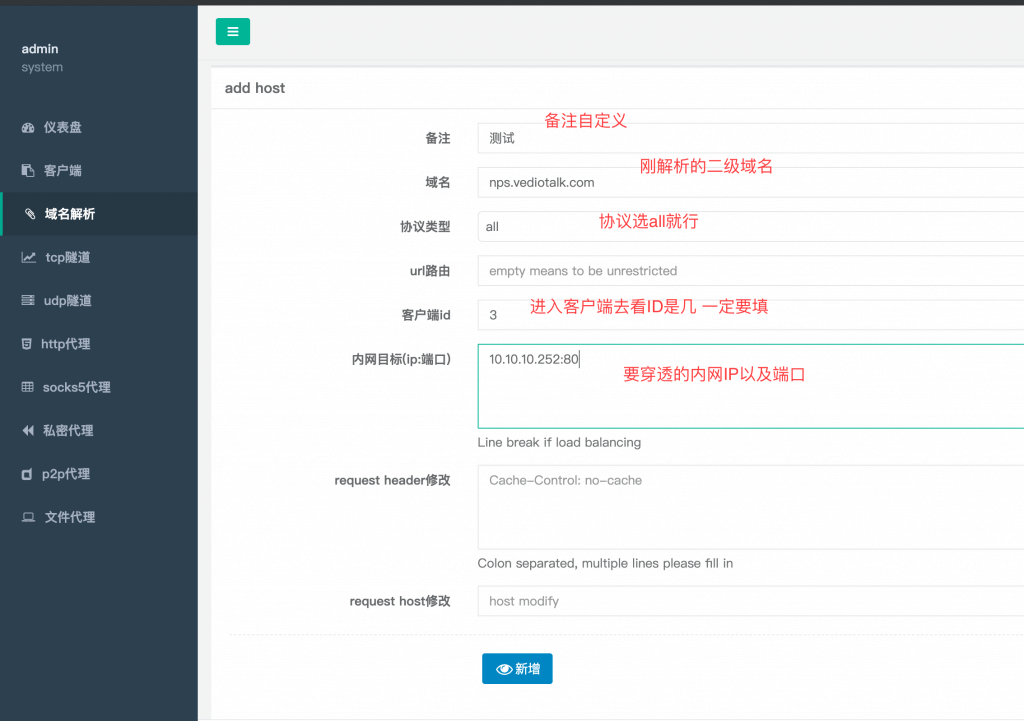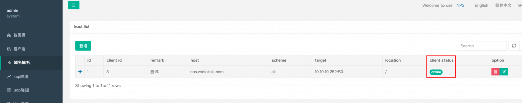 2.进入NPS后台绑定域名以及设置内网IP及端口号