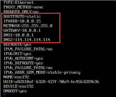 BOOTPROTO=static // 改为static静态ipIPADDR=10.0.0.15 // 设置静态ip地址NETMASK=255.255.255.0 // 设置子网掩码GATEWAY=10.0.0.1 // 设置网关DNS1=10.0.0.1 // 设置DNS1DNS2=114.114.114.114 // 设置DNS2