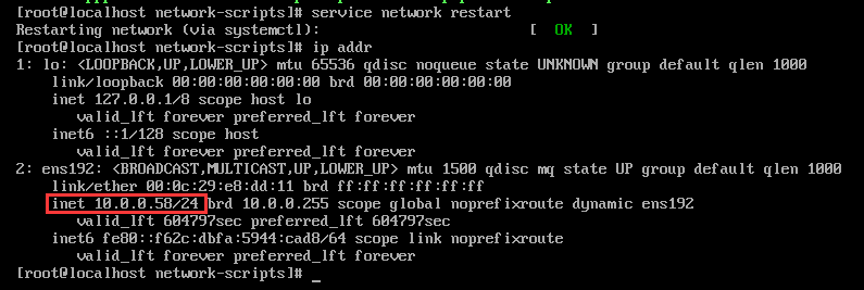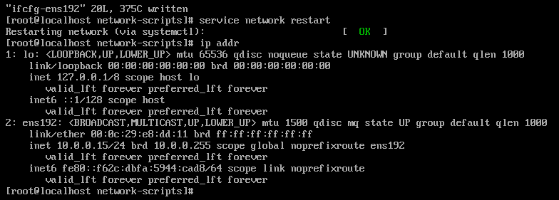 //用vi打开ifcfg-ens192网卡配置文件[root@localhost ~]# vi /etc/sysconfig/network-scripts/ifcfg-ens192//如果已在network-scripts目录的话,可以直接vi ifcfg-ens192比较简单[root@localhost network-scripts]# vi ifcfg-ens192//重启网卡服务[root@localhost network-scripts]# service network restart