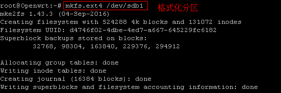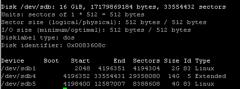 至此创建分区的工作已经完成,可以看到sdb1,4,5,其中sdb1为主分区,sdb4为扩展分区,sdb5为扩展分区中的分区