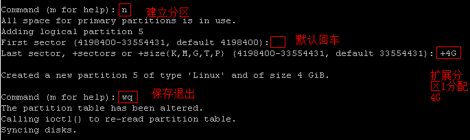 扩展分区中创建分区(如果磁盘空间未全部分配,需要输入l)
