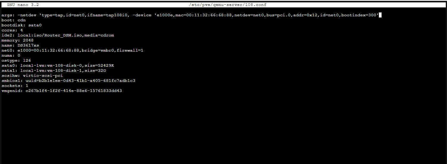 四、在Shell界面,输入以下命令回车,用nano编辑器编辑配置文件(注意108的ID保持与群晖虚拟机的ID一致):