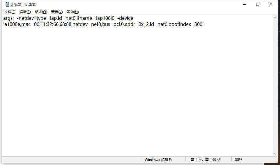 args: -netdev 'type=tap,id=net0,ifname=tap108i0, -device 'e1000e,mac=00:11:32:66:68:88,netdev=net0,bus=pci.0,addr=0x12,id=net0,bootindex=300'