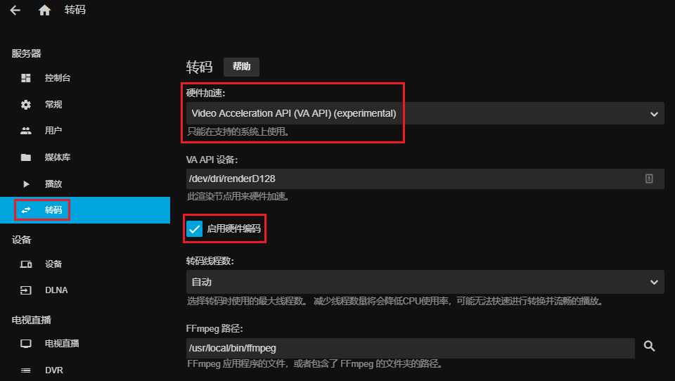2、如果你的Jellyfin版本升级到10.4.3以后,发现设置硬解后保存出错的或者硬解/转码无效的(就是设置了硬解,但是CPU依然暴红),可以回滚到10.4.3版本;或者多做以下两个步骤: