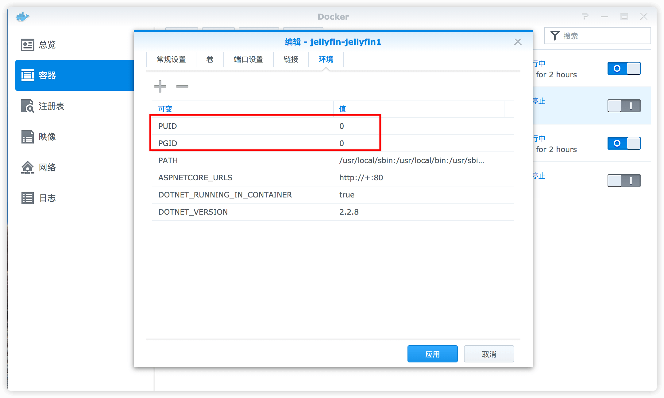 (2)添加环境:在环境中添加两项,分别是 PUID(值填写为 0)和PGID(值填写为0);
