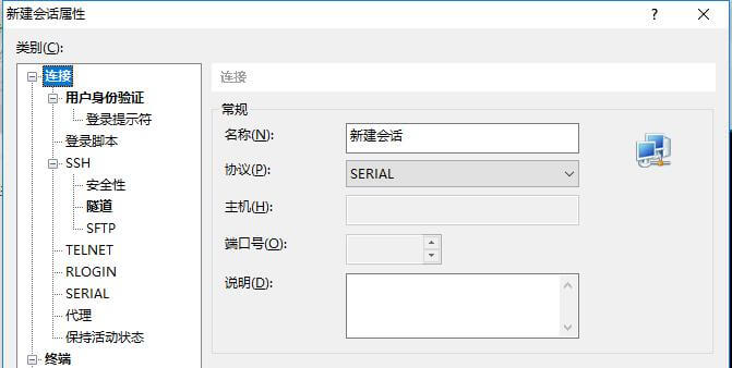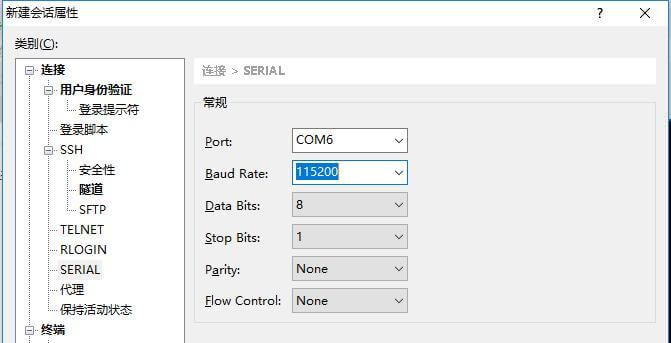 新建会话,协议选择“SERIAL”,并在 SERIAL 选项中设置好“端口”、“波特率”。