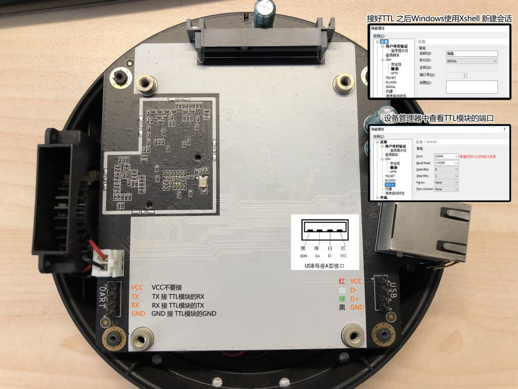 二、猫盘接TTL线,TTL模块插电脑,USB母座插猫盘,USB母座上插入我们刚刚的U盘(猫盘不要接硬盘,不要插电源)