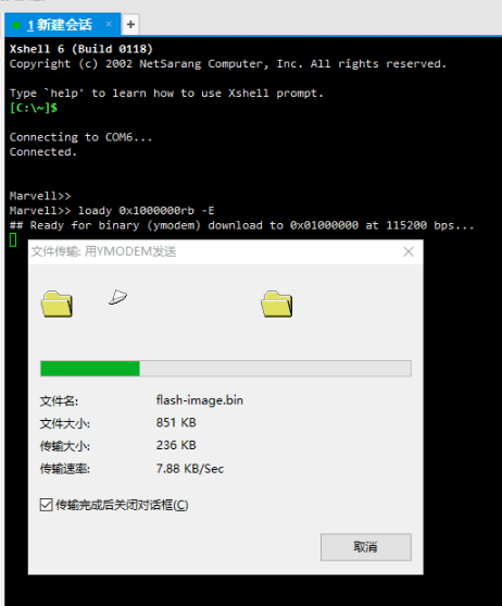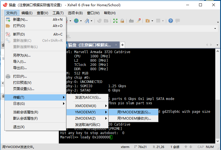 六、点击Xshell的“文件”-“传输”-“YMODEM(Y)”-“用YMODEM发送(S)”,然后选择本压缩包内的“flash-image.bin”上传。参照下图: