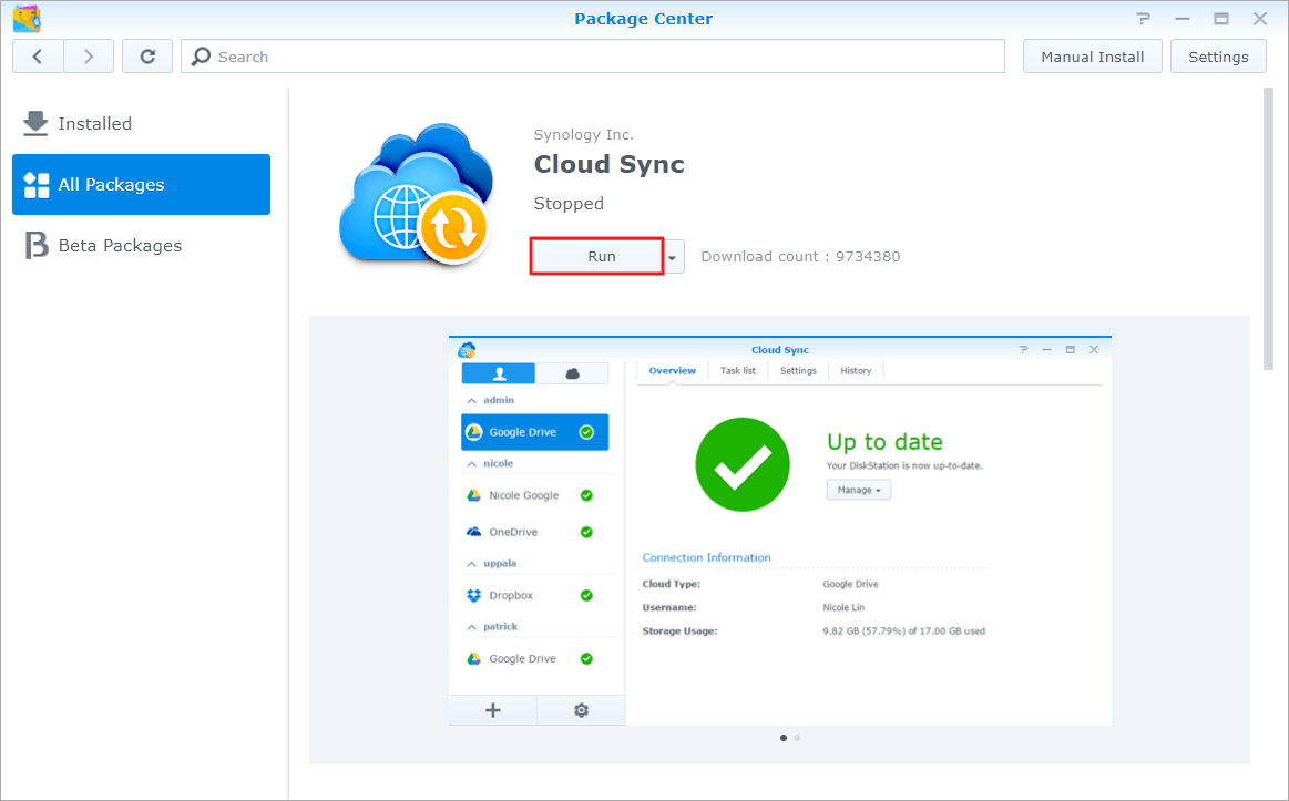 3. 移动完所有数据后,进入套件中心,单击 Cloud Sync 套件,然后单击运行以恢复同步过程。