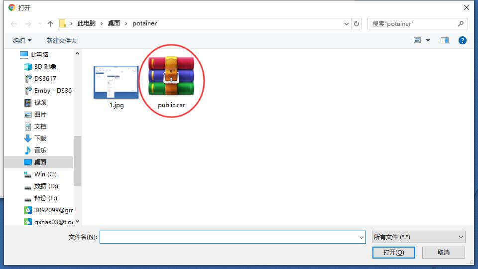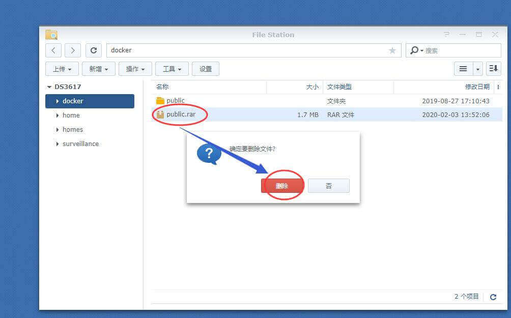 二、登录群晖系统,打开File Station,在docker文件夹下,右键把刚才下载的文件public.rar上传到群晖;