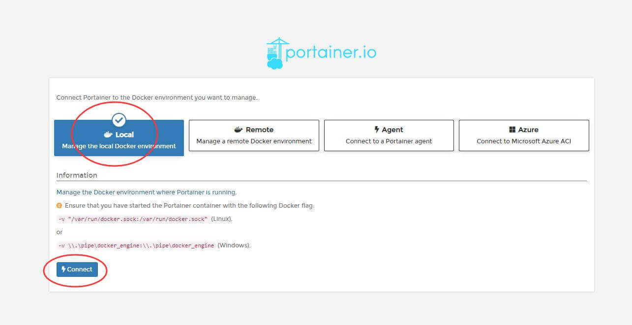 十一、我们这是管理群晖的docker,所以选Local,点Connect继续;