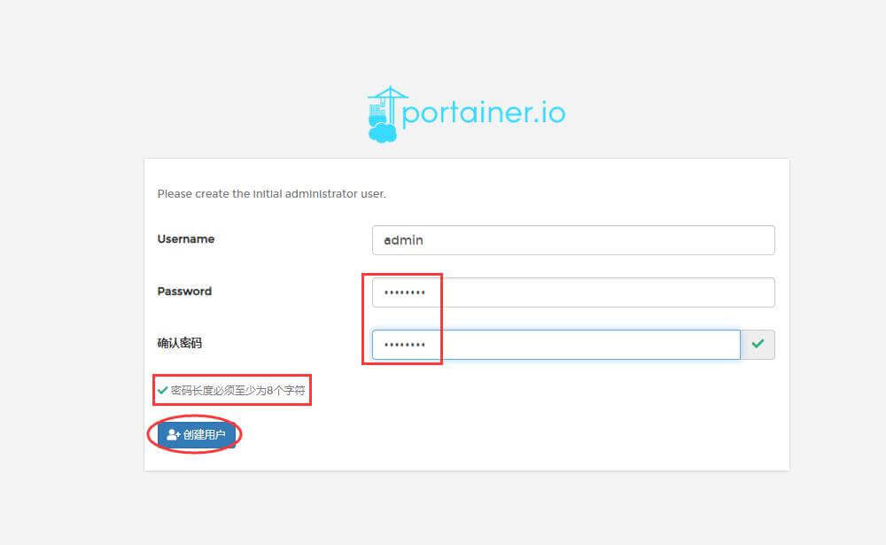 十、在浏览器输入http://群晖的IP地址:9999,登录portainer,首次登录需要设置一个8位的密码,点创建用户;