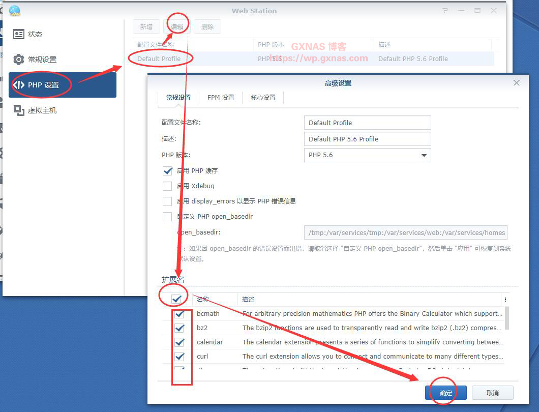 8、PHP设置,选择“Default Profile”,编辑,扩展名,把所有的都打勾,确定;