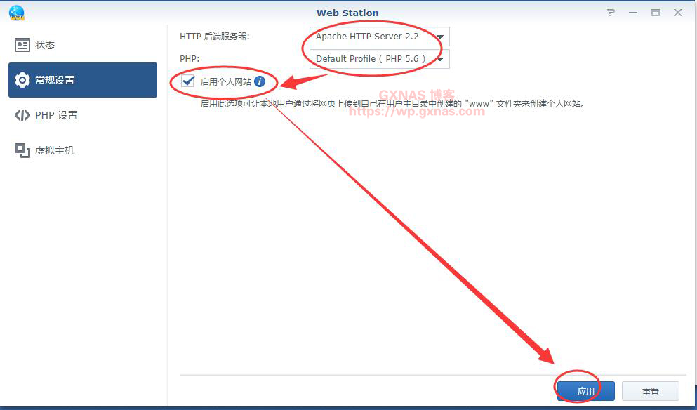 7、HTTP 后端服务器选择“Apache HTTP Server 2.2”,PHP选择“Default Profile(PHP 5.6)”,勾选“启用个人网站”,应用;