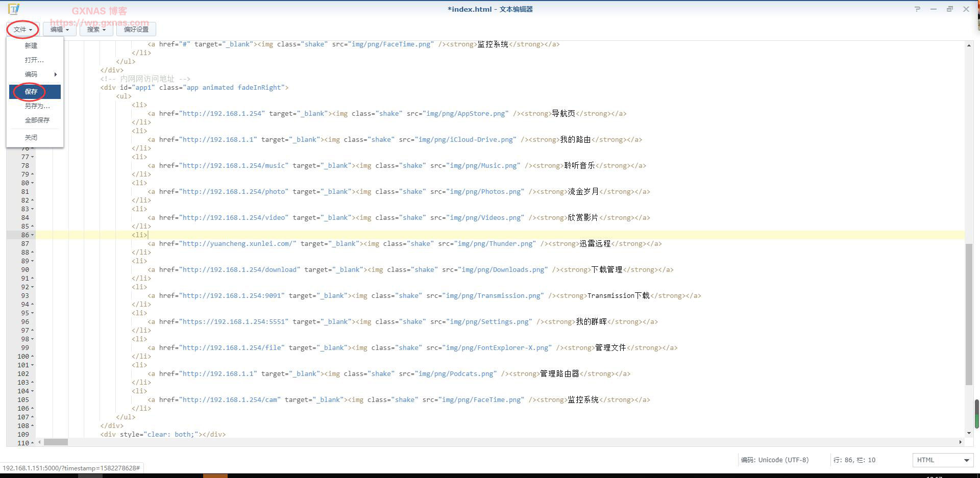 17、但是你会发现,那些图标点了没有用,这是因为链接没做好。所以要再次回到群晖的File Station,进入Web文件夹,选中“index.html”,右键,用文本编辑器打开;