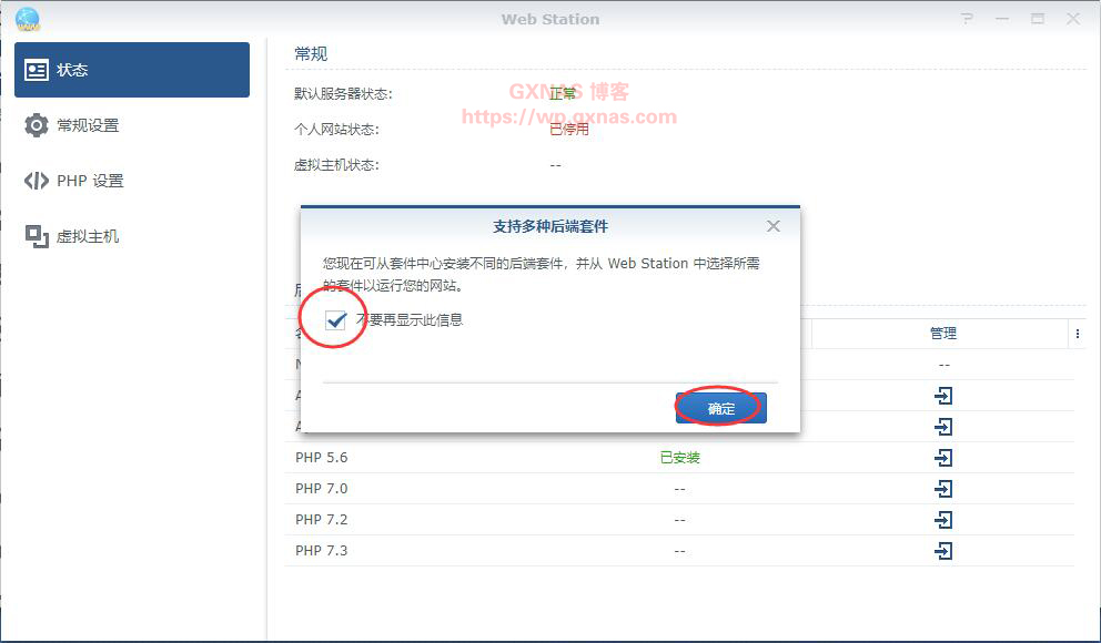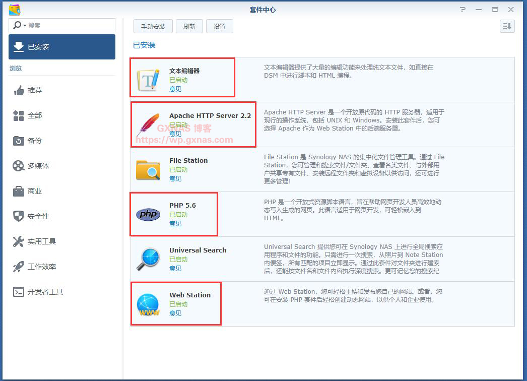 2、登录群晖,在套件中心安装四个套件:文本编辑器、Apache HTTP Server 2.2、PHP 5.6、Web Station,如果有套件已经安装的无需再安装;