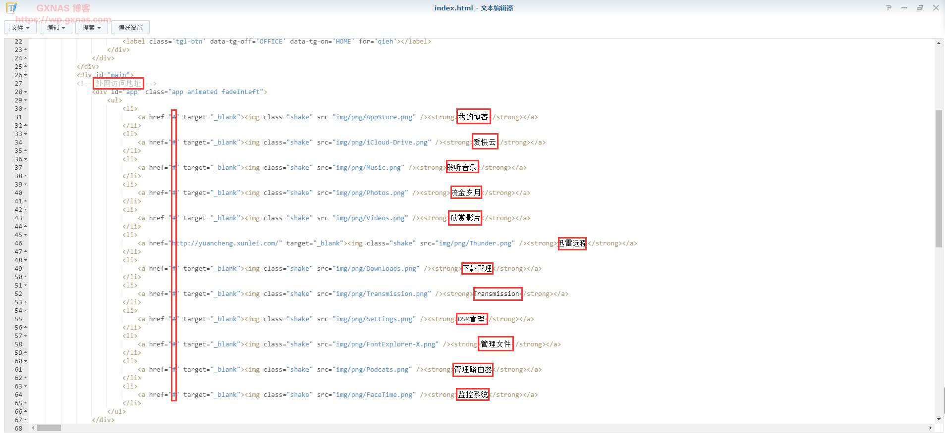 18、再定位到“内网访问地址”,把代码中的“#”以及对该链接的描述文本,根据实际情况修改,改成群晖内网IP地址;