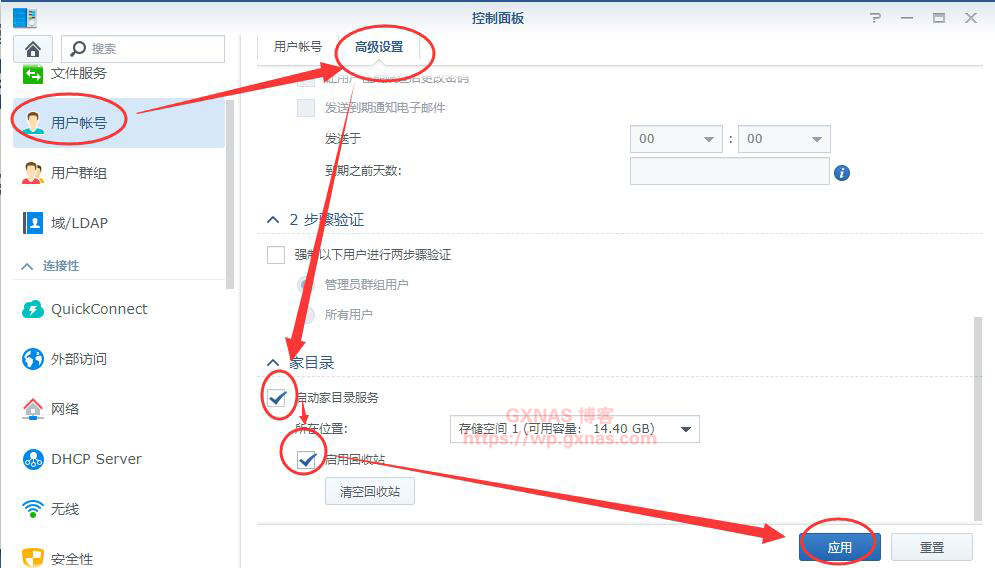 6、打开控制面板“用户账号”-“高级设置”-“家目录”,勾选“启动家目录服务”和“启用回收站”,应用;如果上面第5步不弹出此“用户主目录”已被禁用的,此步骤可跳过;