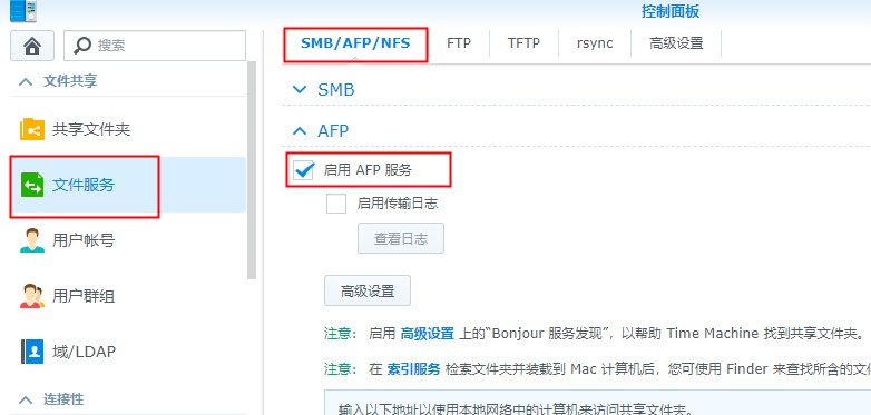 登录群晖NAS管理后台 --> 控制面板 --> 文件服务 --> SMB/AFP/NFS