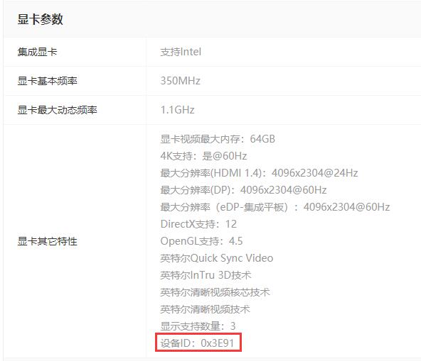 而i3 9100这个CPU我们网上查到的参数(http://detail.zol.com.cn/1270/1269896/param.shtml)是写0x3E91,在下面的支持列表中。因此用i3 9100可以顺利的支持硬件解码,用i7 9700就不行。