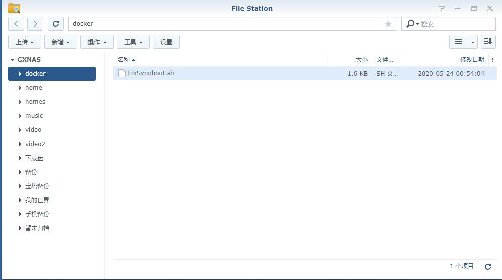 2、把刚才下载的补丁文件,上传到群晖的文件夹(注意不要上传到中文的文件夹,我这里上传到docker这个文件夹下),然后在群晖的File Station找到这个文件,点右键-属性;
