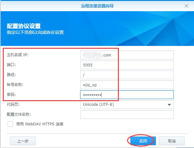 三、在弹出的窗口,填写2号机的相关信息:IP地址或者是域名,WEBDAV的端口,路径(如果想看到全部文件夹就写/,也可以只映射某个文件夹),群晖的用户名和密码,点应用;