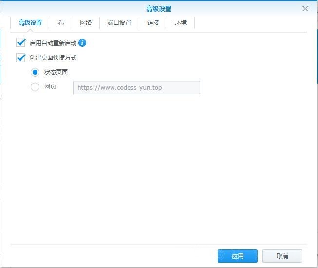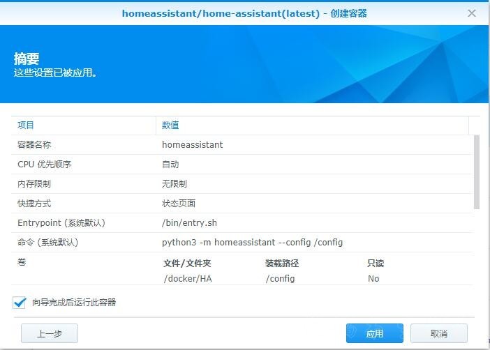 然后,下一步,在这个页面勾选 向导完成后运行此容器,点击应用即可完成安装。