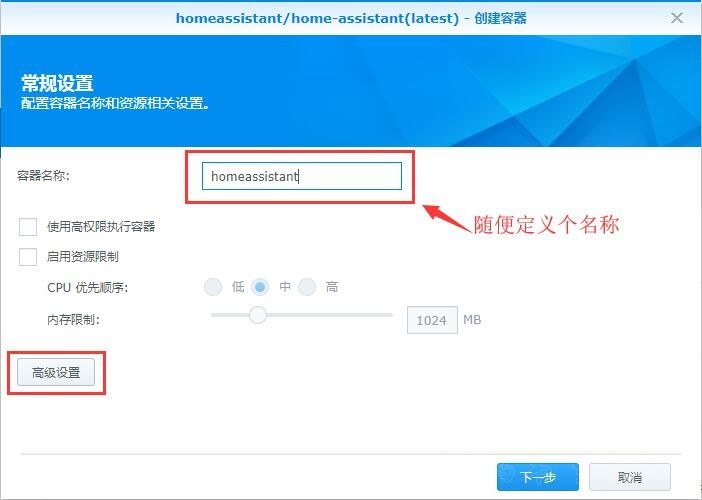 容器名称可以自定义,但是请安图上的写,然后点击高级设置,对容器安装环境进行设置。