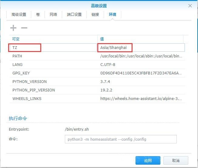 点击上方十号,在 可变 那里填写TZ,值 填写Asia/Shanghai,然后点击应用。
