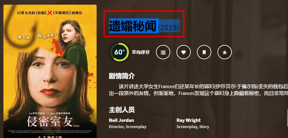 遗孀秘闻.Greta.2018.HD1080P.X264.AAC.English.CHS-ENG.Mp4Ba,这是我下载的电影,文件夹名称和视频文件名都是这种,所以我们要去TMDB上搜索一下 遗孀秘闻 这个电影,并且把这个名称复制下来,给改一下,去TMDB的好处就是可以看到这个影片到底有没有数据信息,或者是有信息,但是没有翻译成中文的,如果没有任何信息,那么就需要自己做数据库了,这里后期讲解如何自己在TMDB上制作数据库,和翻译其他国家的影片为中文信息。