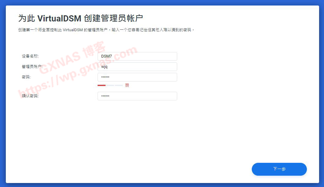 二十四、设置DSM7.0的名称、管理员账号(这里不能用admin)、登录密码,设置无误以后点“下一步”;