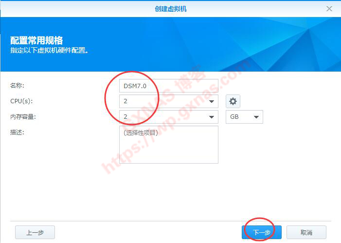 九、配置常用规格(分配给DSM7.0的配置),填写名称,分配CPU核心,分配内存,下一步;