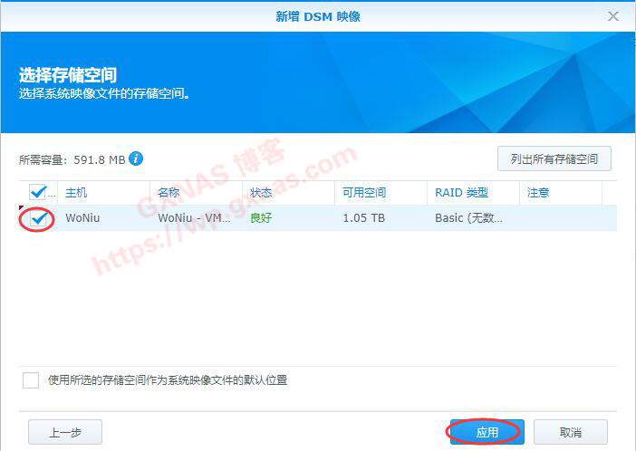 八、新增DSM映像,选择存储空间,选择你要保存的磁盘空间,我这只有一个硬盘,所以没得选择,就直接