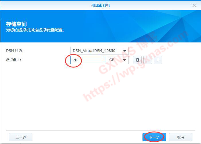 十、存储空间,虚拟盘1,根据自己实际情况给DSM7.0分配一个硬盘容量(我这就玩玩而已,只分配了20G),下一步;