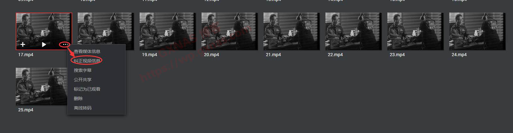 5、好吧,那就只能一个一个的手工修正了,那从17集开始吧,鼠标移到第17集上,右边会显示三个小点,点它会出现一个菜单,选“纠正视频信息”。