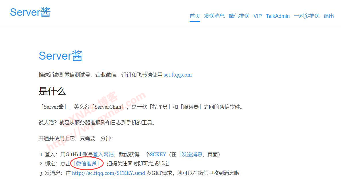 2、再打开这个提供微信推送服务的网站(地址:http://sc.ftqq.com/),点下图位置的“登录网站”;
