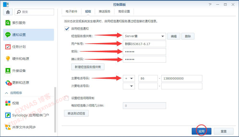 如果你的群晖系统版本是6.1X 版本,短信服务提供商选我们刚刚添加的“Server酱”,用户账号自己写一个(你写什么内容,微信收到的信息标题就显示这个内容),密码随便写,确认密码和密码内容要一致,主要电话号码填上+86-13800000000(这里的电话号码可以按照手机号码格式随便写,并非用此号码发送短信,所以不用担心费用问题),应用;