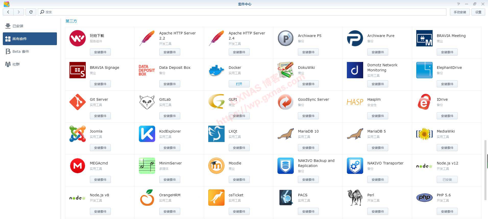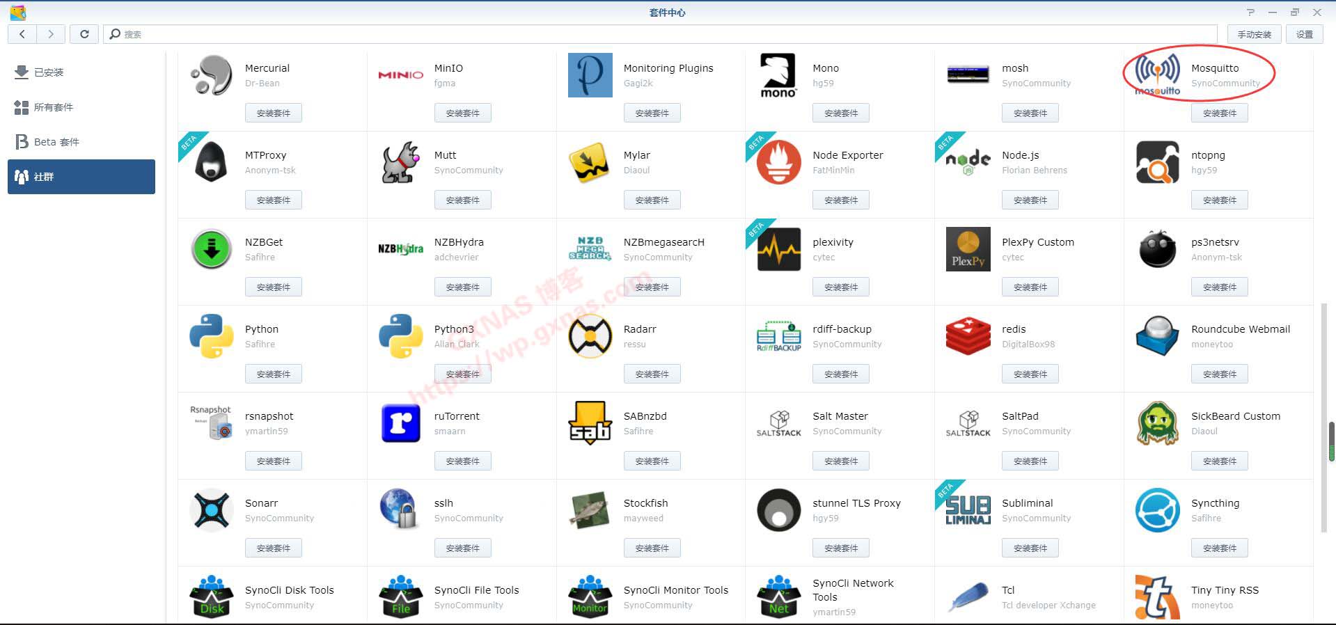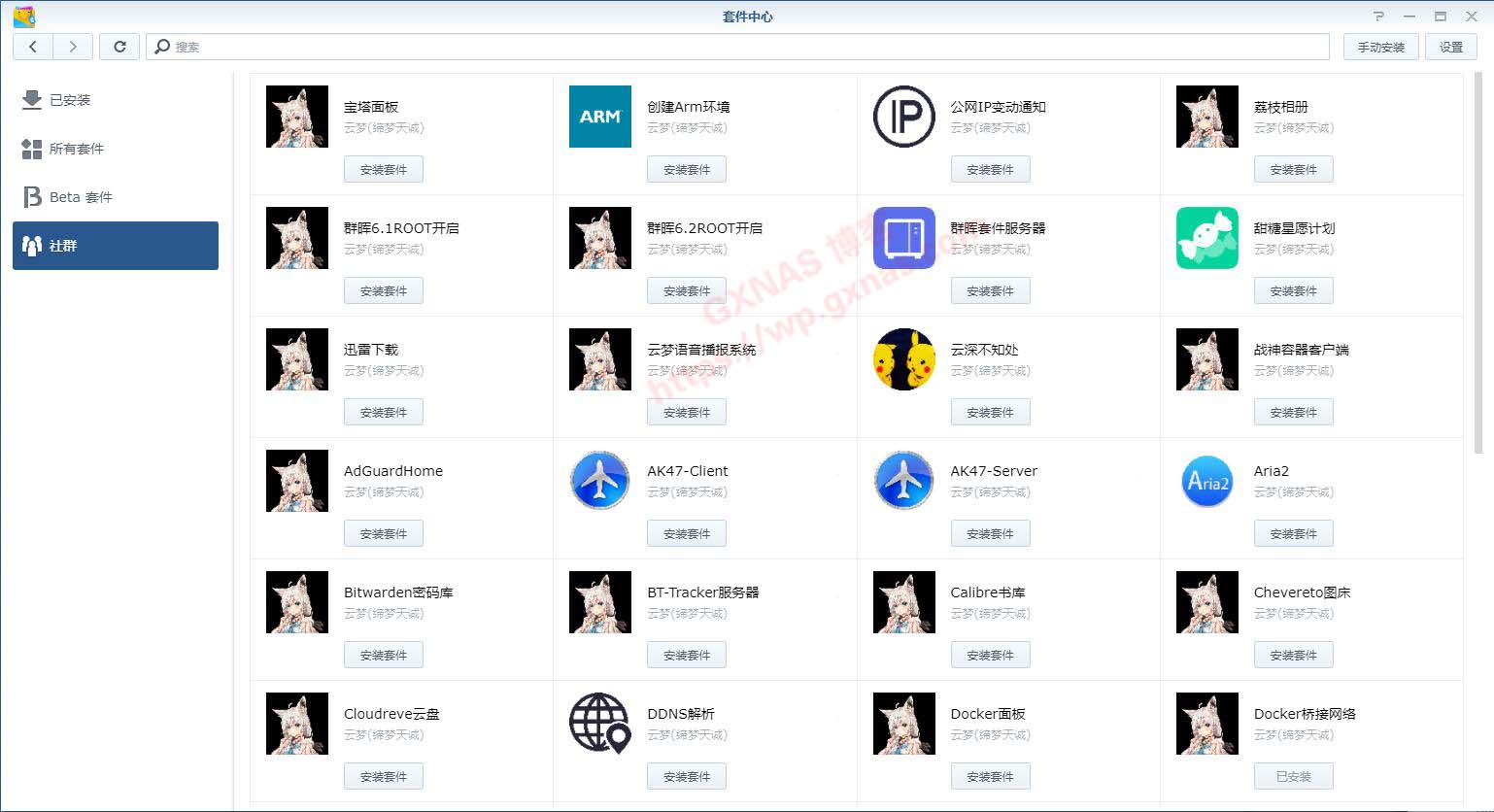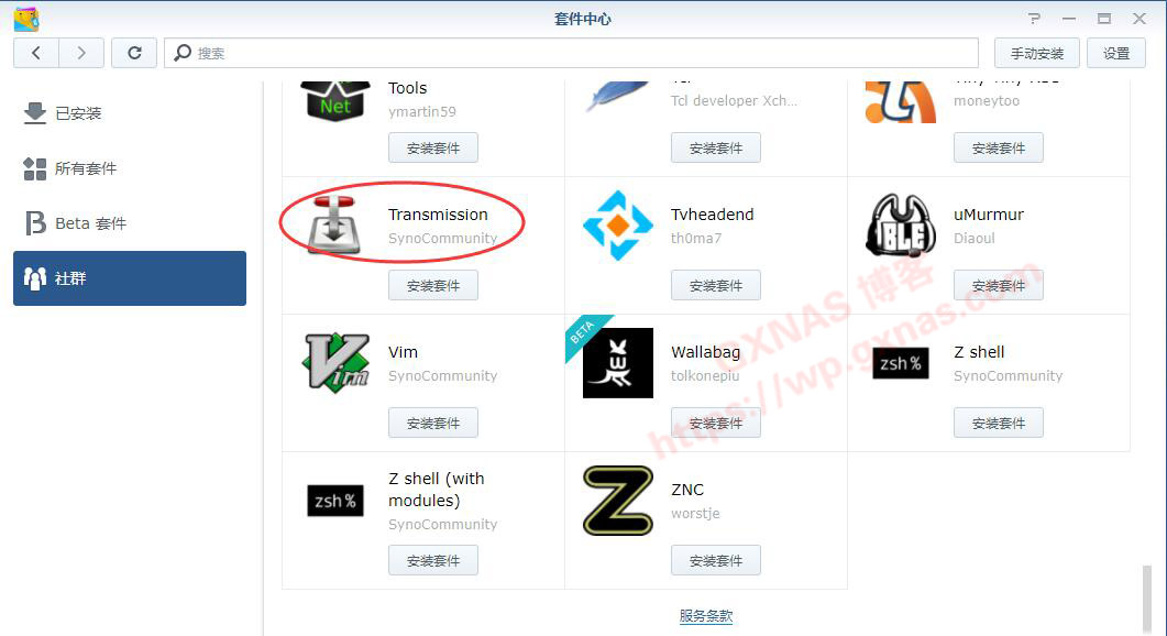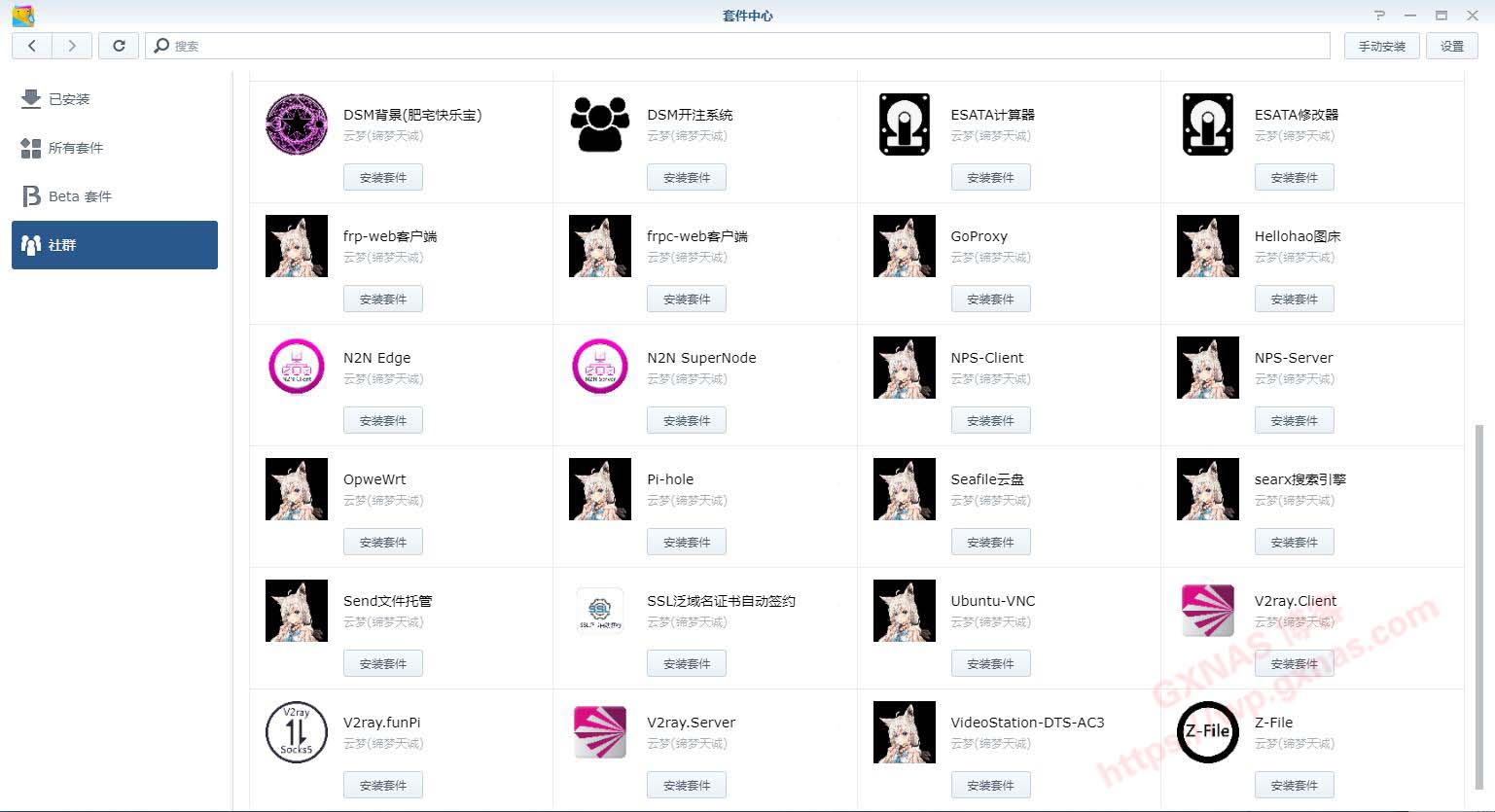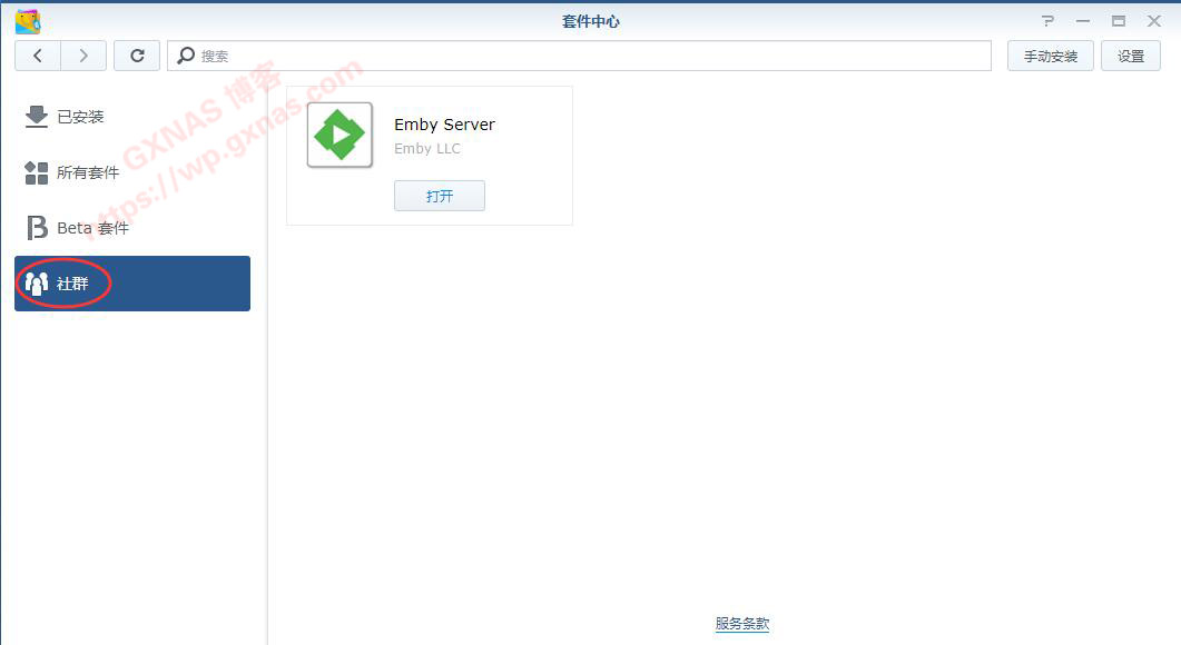 ⑤套件中心左边菜单,会多出一个社群,点进去,就看到EMBY套件了,我已经安装了此套件,所以显示可以打开;