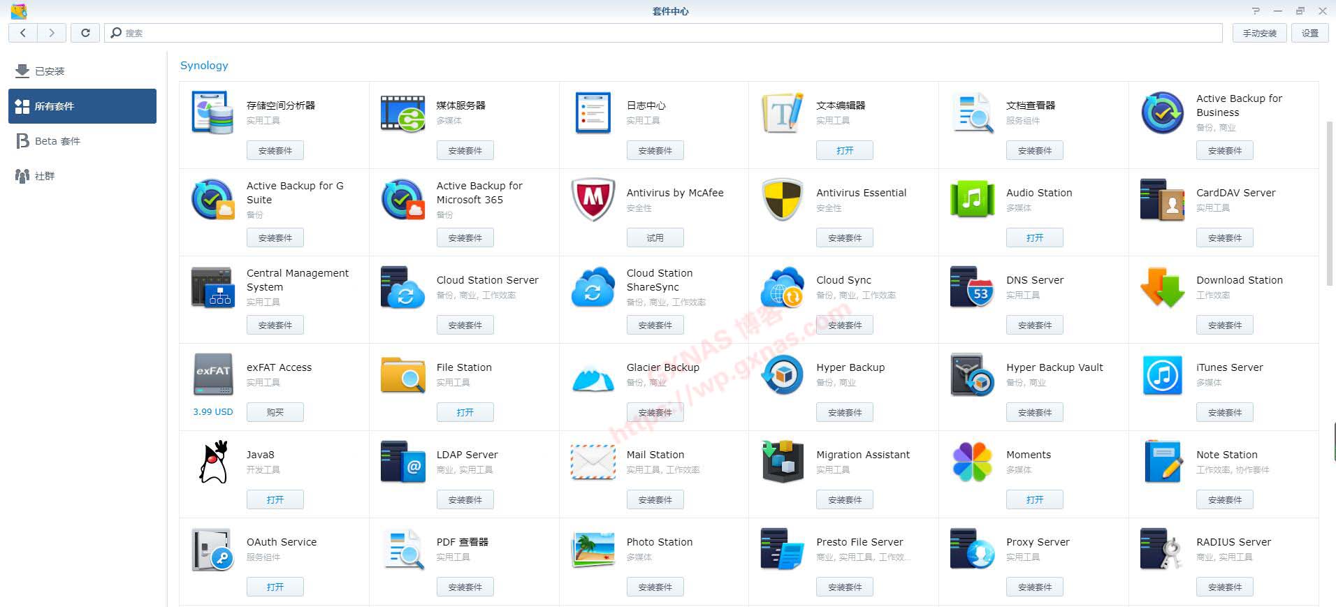 群晖系统安装完成后,默认只有一个File Station可以对文件进行操作的用途。群晖系统桌面的套件中心,内置了可以在群晖系统内安装的应用程序,我们可以理解成相当于手机的应用商店。