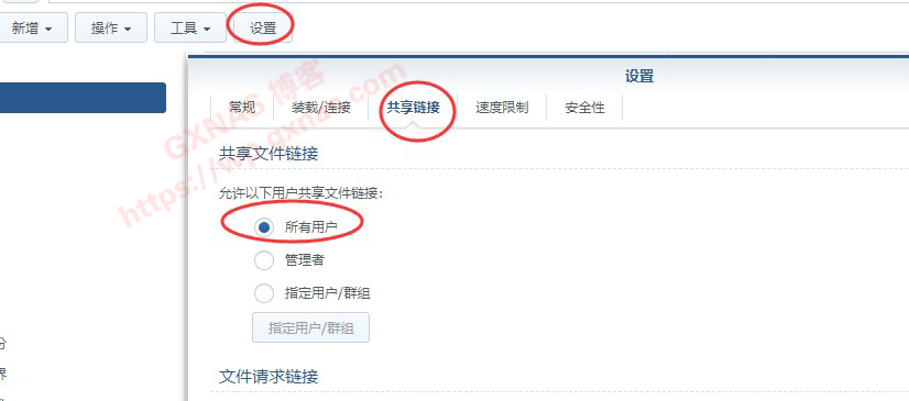 首页 教程 群晖 今天有一个网友联系我说:群晖的普通用户登录后,在File Station里面在文件上点右键,没有分享功能,只能管理员登录以后才可以分享。问我怎样解决?于是我告诉他:1、在电脑浏览器用管理员账号登录群晖;2、打开File Station;3、点菜单上的“设置”,在弹出的对话框中,点“共享链接”,找到“允许以下用户共享文件链接”,把它改成“所有用户”,确定。