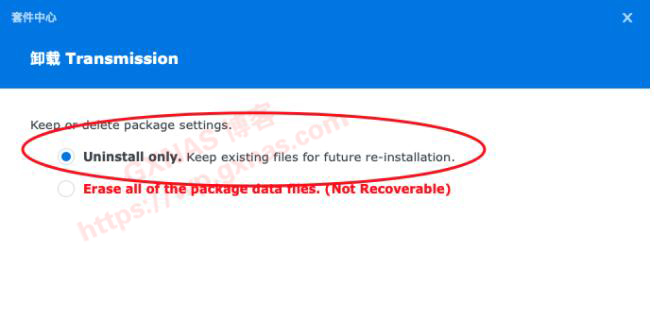 4、在套件中心卸载TR。此步骤务必看清楚下图的选择,如果你手抖选错了,小姐姐的种子数据就会灰飞烟灭;